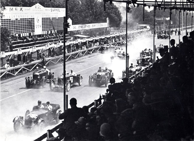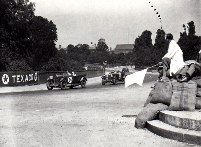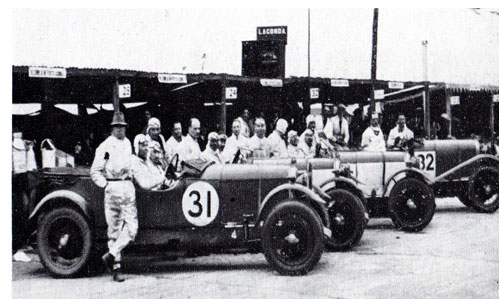 Aero-screens, plus a full width, fold flat, wire mesh were also fitted. This car also appeared from time to time with long wings, which in fact it wears at the moment. The original colour is uncertain, having been reported as black, green and sometimes grey. Though the four cars were prepared at Fox and Nicholl at Tolworth, and were, in fact, registered in Arthur Fox's name, PK 9201 and PK 9202 were owned by a syndicate under the name PERR. Arthur Fox owned PK 9203 and R.R. Jackson PK 9204, the PERR syndicate being Bill Edmondson, Cecil Randall, Arthur Pollard, George Roberts and Tim Rose Richards. Only one Lagonda was entered for Le Mans, 15-16 June 1929. This was Arthur Fox's 2 litre PK 9203, driven for him by Tim Rose Richards and the Hon. Brian Lewis. PK 9203 outside the Fox and Nicholl service station. Unfortunately, the car blew a head gasket and retired after 283 miles. To the right is the original shipping document for PK 9203 to travel from Newhaven to Dieppe on 6th June 1929 for Le Mans at a cost of £22.17s.0d. Above is Arthur Fox's International Traveling Pass again for Le Mans showing the car in cream and black. Despite only one car being entered for Le Mans, eight Lagonda cars were entered for the BARC six-hour race, held at Brooklands on 29 June. These were the four 2 litre team cars and two 3 litre cars, all entered in the name of A.W. Fox, plus a 2 litre privately entered and driven by R.S.S. Hebeler, with Ian Hepburn as co-driver. Bentley won the race as they did at Le Mans but the Lagonda team had nothing to be ashamed about, Hindmarsh winning the 2-litre class, with the 2 litre driven by Rose Richards and Randall a creditable ninth overall at an average speed of 63.98 m.p.h. The Fox team of Rose Richards and Randall, Roberts and Pollard, and Lewis and Jarvis took the 2-litre class prize, the Mobil Oil Cup. The next outing was the Irish GP on the 13th July 1929 at Phoenix Park, Dublin, where three Lagondas were entered, all in the name of A.W. Fox. They were Robin Jackson's 2 litre, Arthur Fox's 2 litre thought to be driven by Euan Rabagliati and a 3-litre driven by John Hindmarsh. Jackson finished ninth overall at an average speed of 67.81 m.p.h. He is seen below in full flight during the course of the race. To the left is a copy of the original program from the Irish International Grand Prix. The left picture below shows the start of the Irish GP. The centre pages of the program above contained a version of the leaderboard in the picture to be filled in by spectators. The 1929 Fox and Nicholl team cars were in fact prototypes of the L/C 2 Litre Speed Model. The above history was extracted from Geoffrey Seaton's book ‘Lagonda - An Illustrated History 1900 - 1950’ and from the original records and comprehensive history file created for the cars by Ivan.