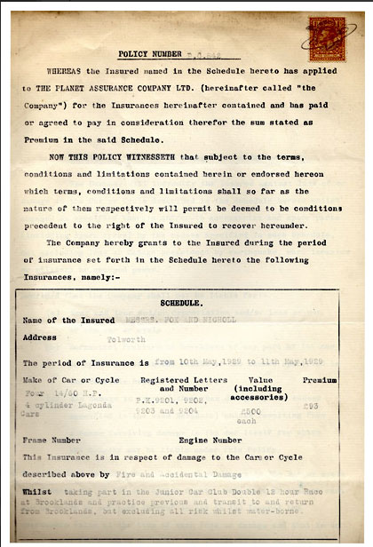 The Fox & Nicholl Team of Four 1928 Lagonda 2-litre Low Chassis Tourers 'PK 9201', 'PK 9202', 'PK 9203' and 'PK 9204' were acquired by Ivan Forshaw between 1948-1961 and subsequently restored by Willie Reeves, George Williams and Simon Spenceley at Aston Service Dorset under the strict watchful eye of Ivan. A considerable amount of thought was put into the four 2 litre cars that were developed for the 1929 racing season. The engines were highly tuned like the previous season but for this season the introduction of a new low chassis was an important development. This was achieved by creating a much greater drop between the stub axle and the spring platforms on the front axle beam; it was also formed in such a manner as to allow the brake perrot shafts to pass through the beam instead of being fitted below it, as on the high chassis cars. At the rear, packing blocks were placed between the top leaf of the rear springs and the axle spring platforms to reduce the height to that of the front. The two main chassis cross members were reduced in depth immediately inboard of the main side members, so that the floor could sit within the side members, and a front cross member, heavily dished in its centre as on the 1928 racing cars, to allow the crankshaft-driven generator to protrude between it and the radiator. The radiator and the bulkhead were lowered some two inches to give a lower body line, the rear of the bodies being cut short and raked to make room for a 25-gallon petrol tank. The tank was pressurised by a hand pump mounted on the left side of the instrument board, obviating the need for a petrol pump. The first outing for the Fox and Nicholl cars was the 1929 Brooklands Double Twelve meeting. In addition to these four cars, the works entered the very fast H/C 2 litre, always assumed to be PK 2339 (but now seemingly fitted with an L/C engine), for Mike Couper to drive. This he did single-handed, winning the 2-litre class prize at an average speed of 66.48 m.p.h. and covering over 1,595 miles during the race. Edmondson and Roberts were second in the class, with Jackson and Broomhall, and King and Wolfe taking third and sixth places respectively. PK 9201, the Rose Richards and Randall car retired on the second day with a broken crankshaft. The second photograph shown was taken alongside the Lagonda pits after winning the Sir Charles Wakefield class prize, Brooklands Double Twelve 1929. Robin Jackson is at the wheel of car number 31 (PK 9204), Broomhall stands behind it, as does Frank King (bald head), whilst Howard Wolfe can be seen at the wheel of the second car from the left, race number 30 (PK 9203), with Tim Rose Richards (without helmet) and Cecil Randall standing behind it. Third from left is PK 9202, race number 25, with Bill Edmondson and George Roberts. Car number 32 is the works entered H/C car, driven single-handed by Mike Couper, seen here with goggles around his neck. Above is the front cover from an original program for the Brooklands Double Twelve. The third photo is the insurance document for the cars, permitting them to race at the Double Twelve.